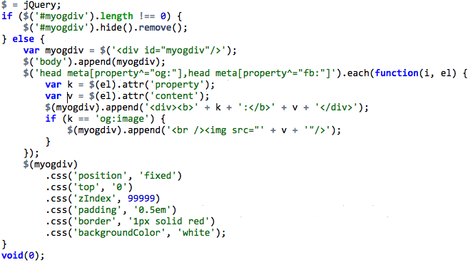 Drag that link to your browser’s bookmarks toolbar. Then on any web page, click it to view the Opengraph information. Click it again to dismiss the overlay. The bookmarklet assumes that jQuery is already loaded on the page. If you are working with sites that aren’t using jQuery, you can use the jQuerify bookmarklet to inject jQuery on the fly for testing.
